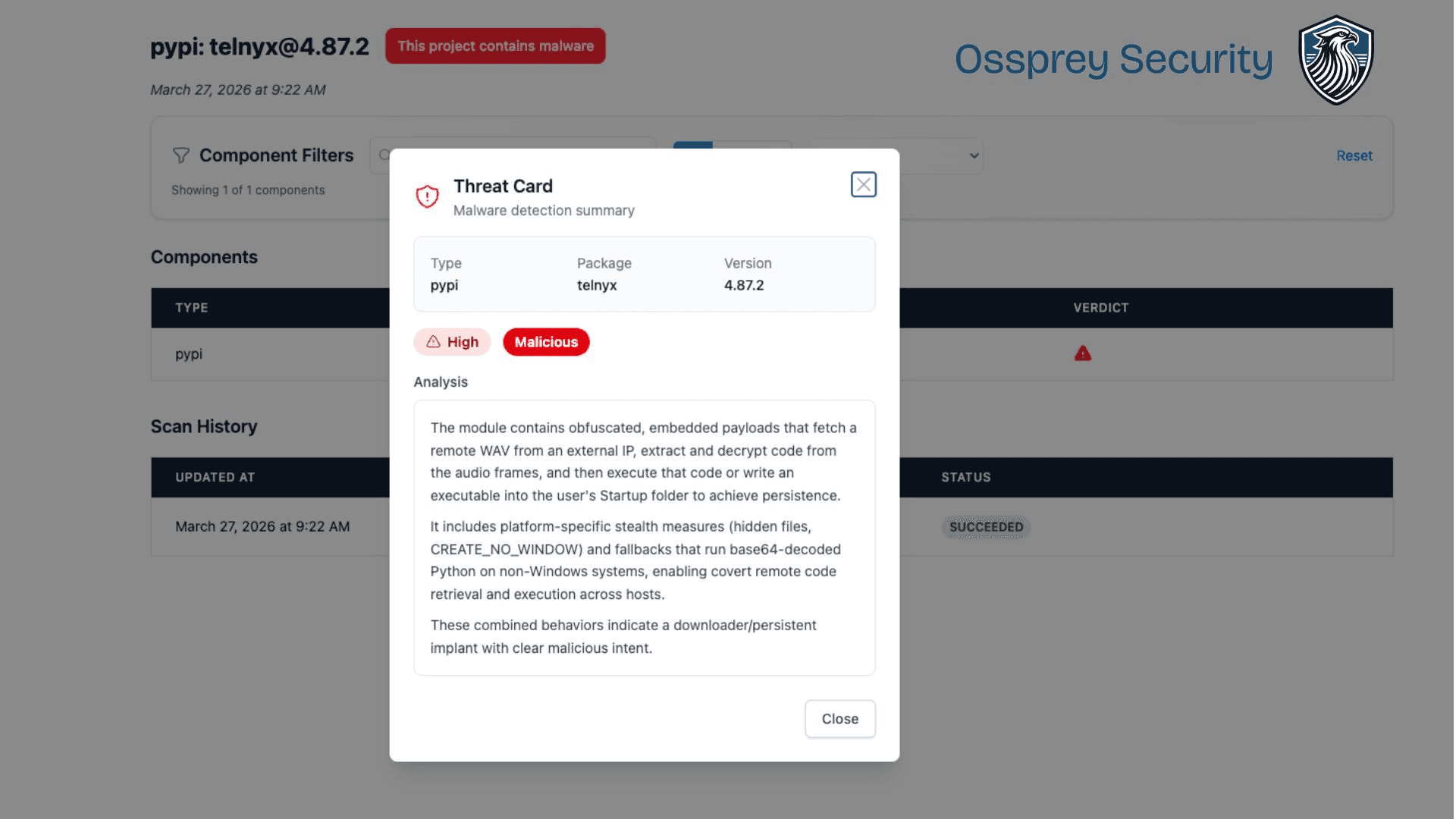 Mar 27 | Telnyx SDK compromised | Ossprey detects malicious PyPI versions 4.87.1, 4.87.2 - this post |